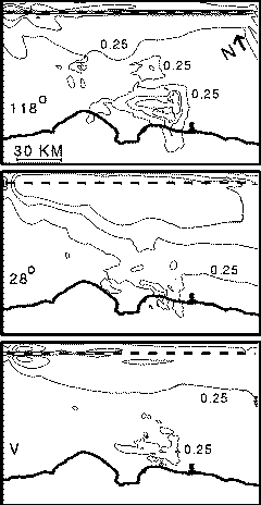 Contour maps of simulated peak velocities along 118 deg, 28 deg, and vertical components for the hypothetical SAF earthquake. Contour interval is 0.25 m/s with the 0.25 m/s contour labeled. Lines labeled as in Fig. 1.